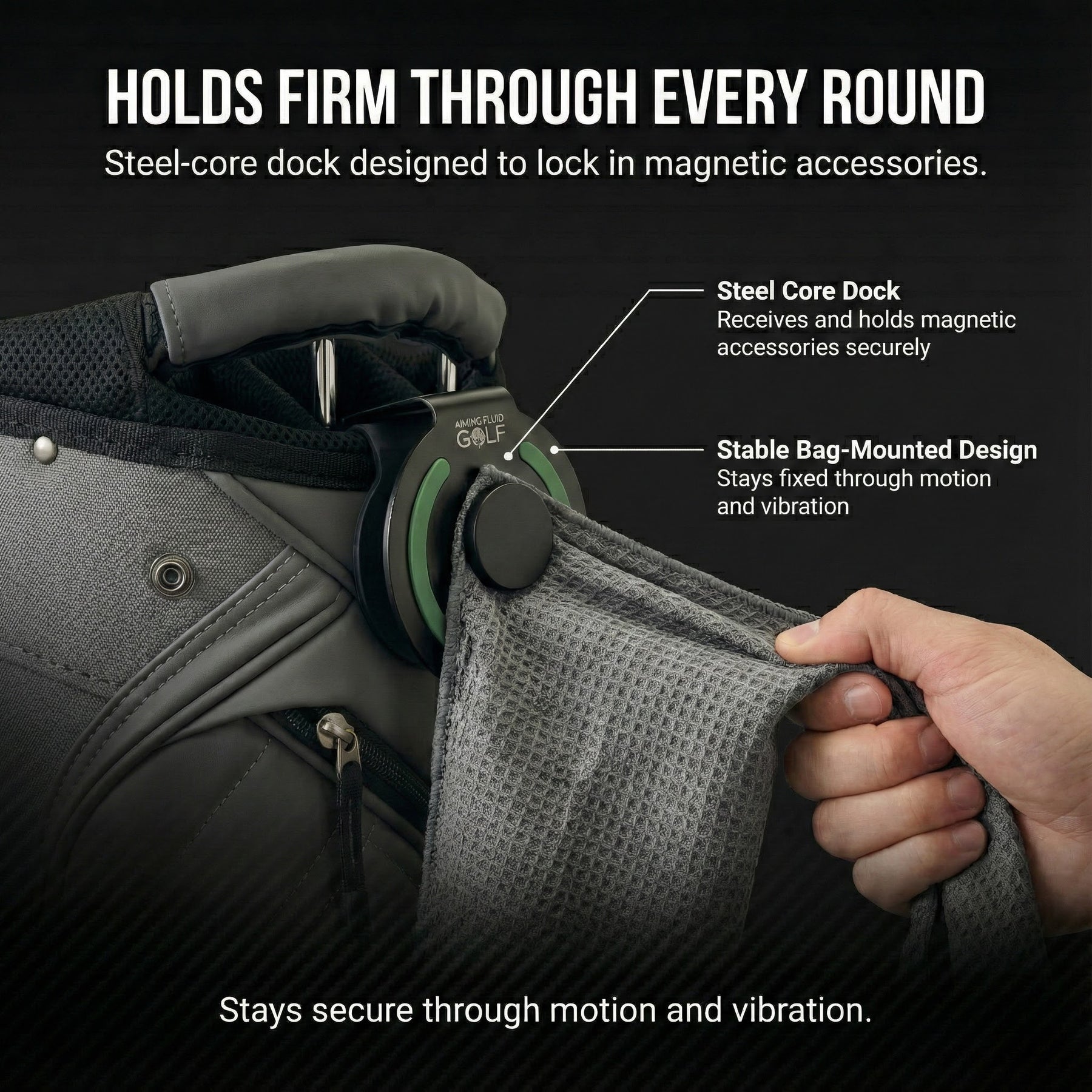 It creates a dedicated docking point on bags that don’t offer a reliable magnetic surface, keeping magnetic accessories stable, reachable, and consistent throughout the round.