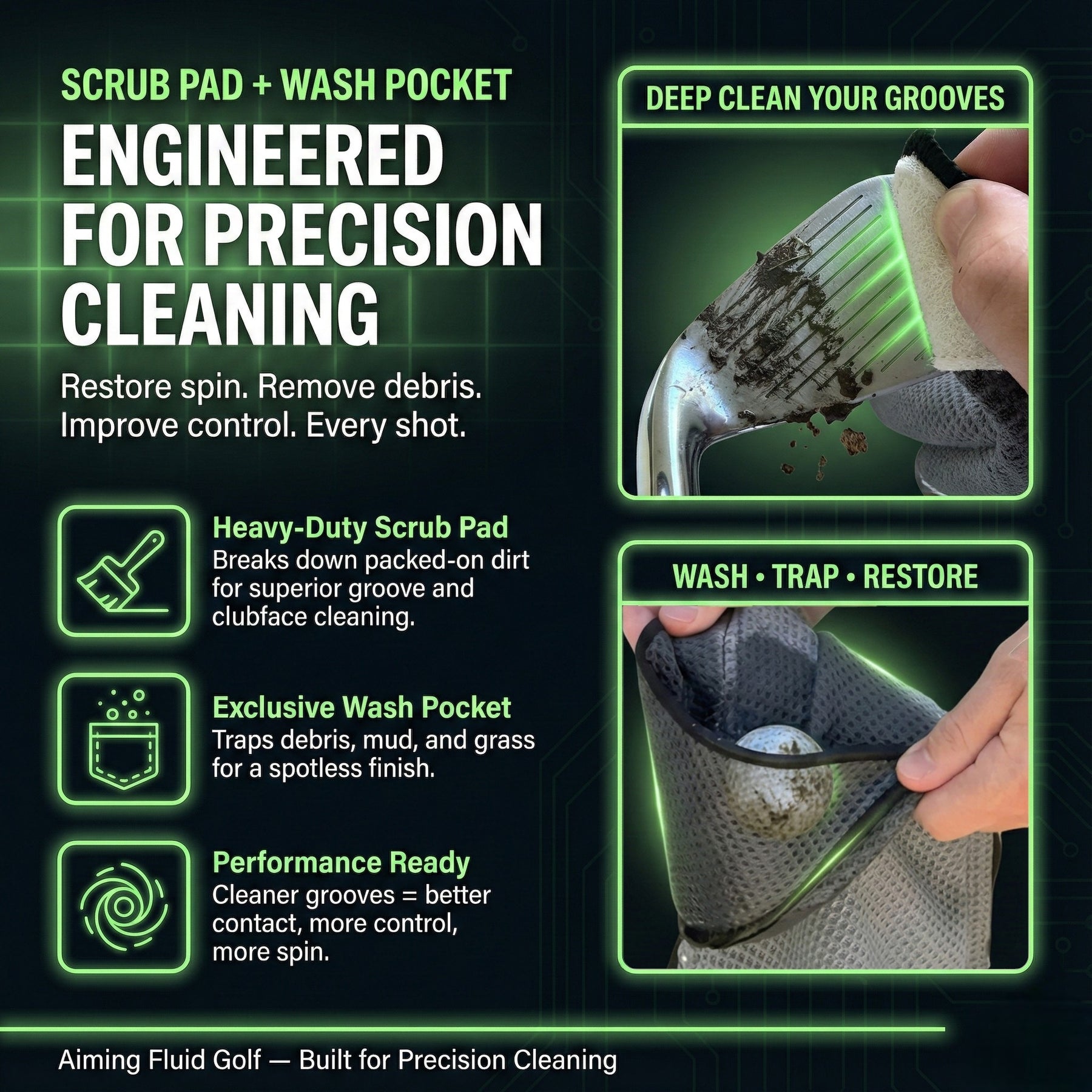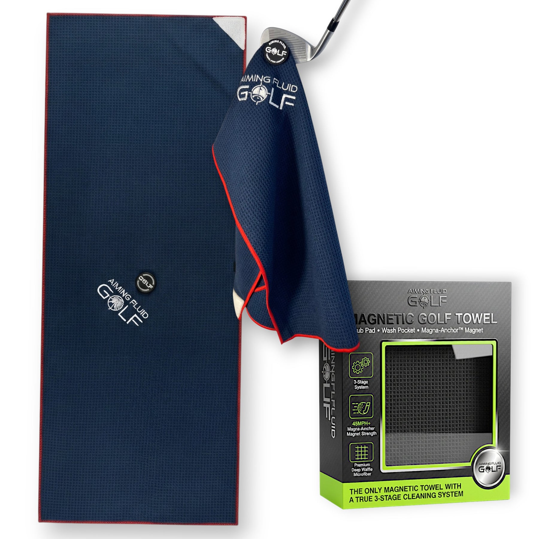 Aiming Fluid Golf towels are built as a system, not a gimmick. Each towel features an industrial-strength Magna-Anchor™ magnet, deep waffle microfiber for real groove cleaning, and an exclusive internal wash pocket that isolates moisture so the rest of the towel stays dry.